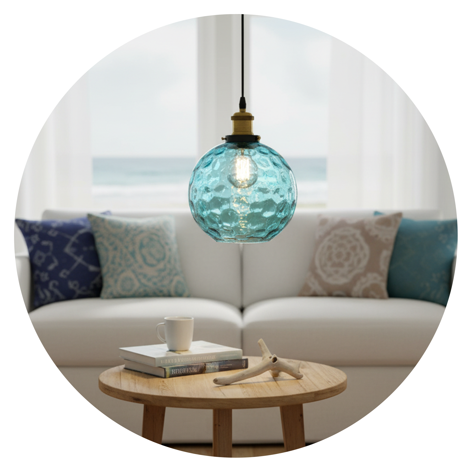 | Description | A calming blue glass pendant that captures the beauty of flowing light and soft reflections. |