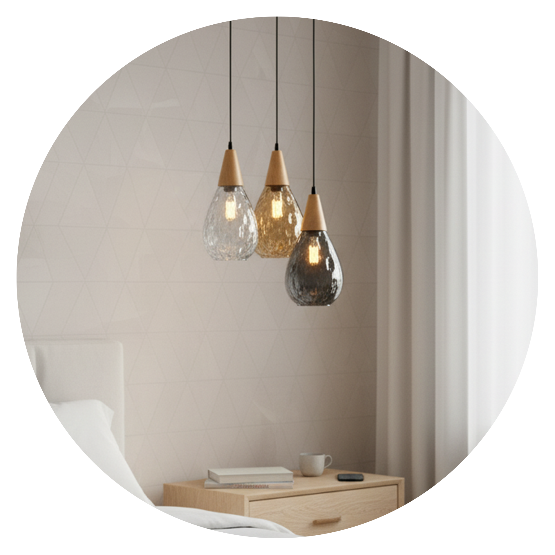| Description | A sculpted glass pendant with a water ripple texture that creates dynamic reflections and a warm ambient glow. Designed with a natural wood accent for a soft Nordic touch. |