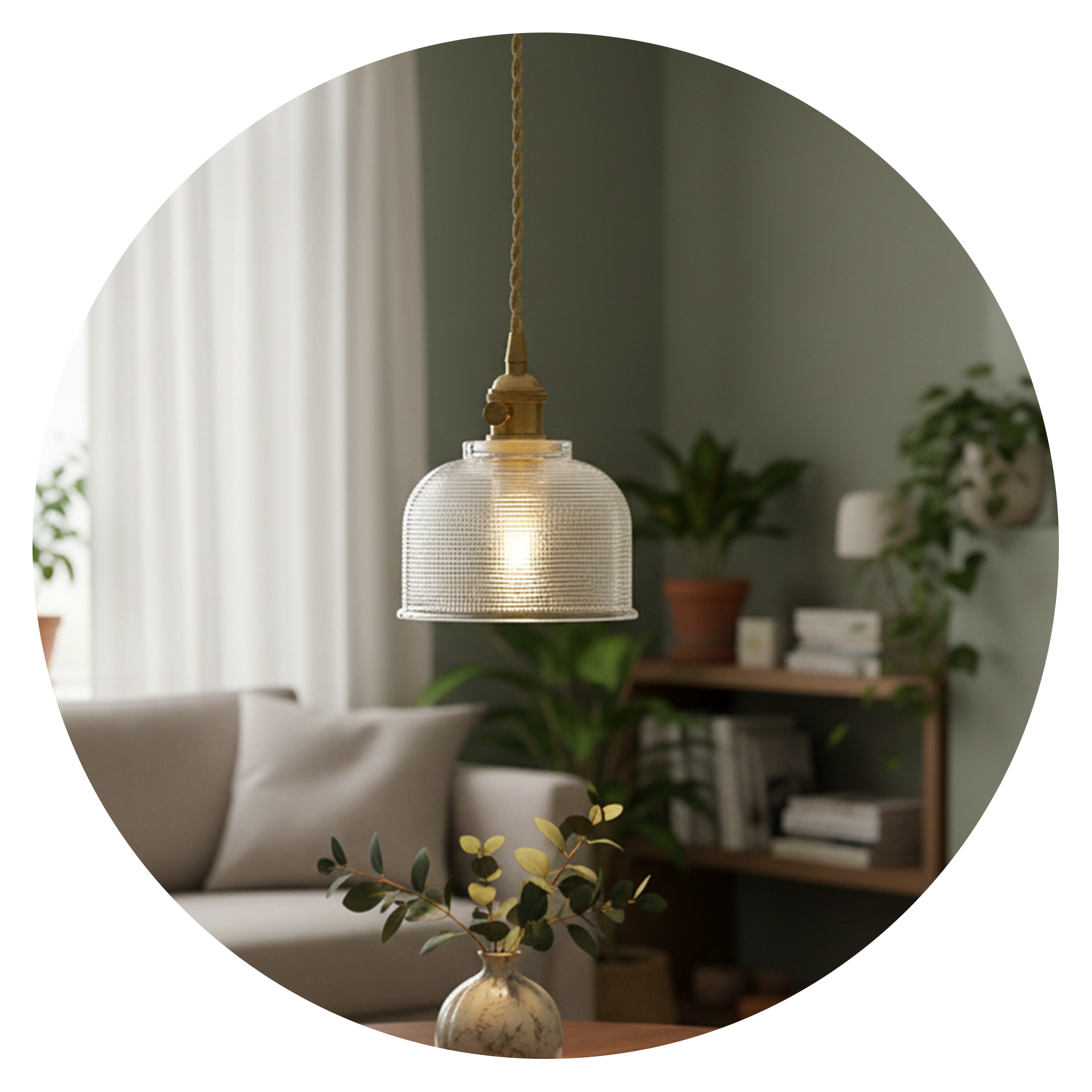 This pendant light features a layered glass dome design with fine horizontal detailing, creating a calm and balanced lighting effect. The structured glass surface softens brightness while maintaining clarity, making the light feel gentle without losing definition.