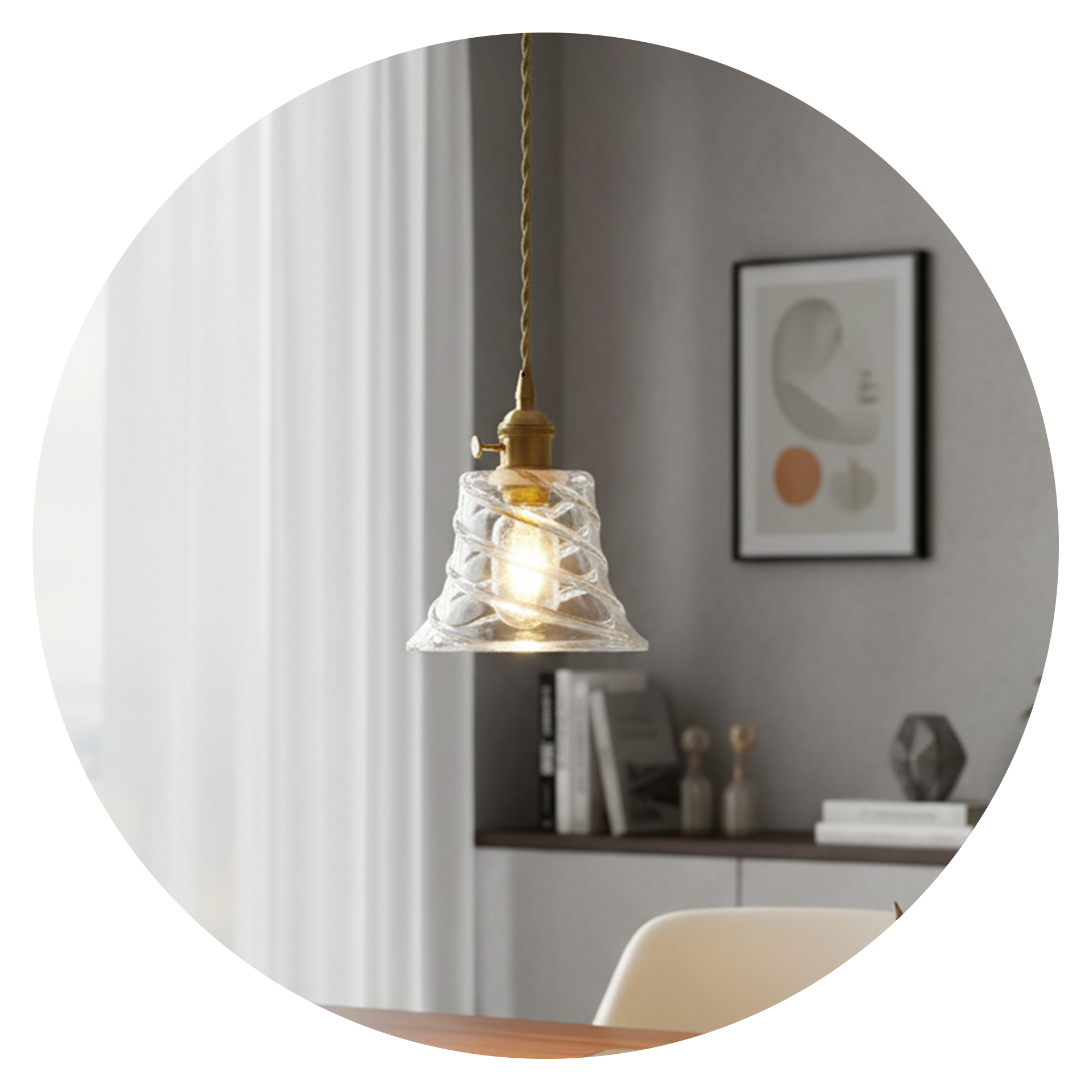 This glass pendant light features a sculpted twisted shade design that diffuses light softly, creating a warm and dynamic lighting effect. The spiral glass texture enhances visual depth and adds a sense of movement, making it both a functional lighting piece and a decorative highlight.