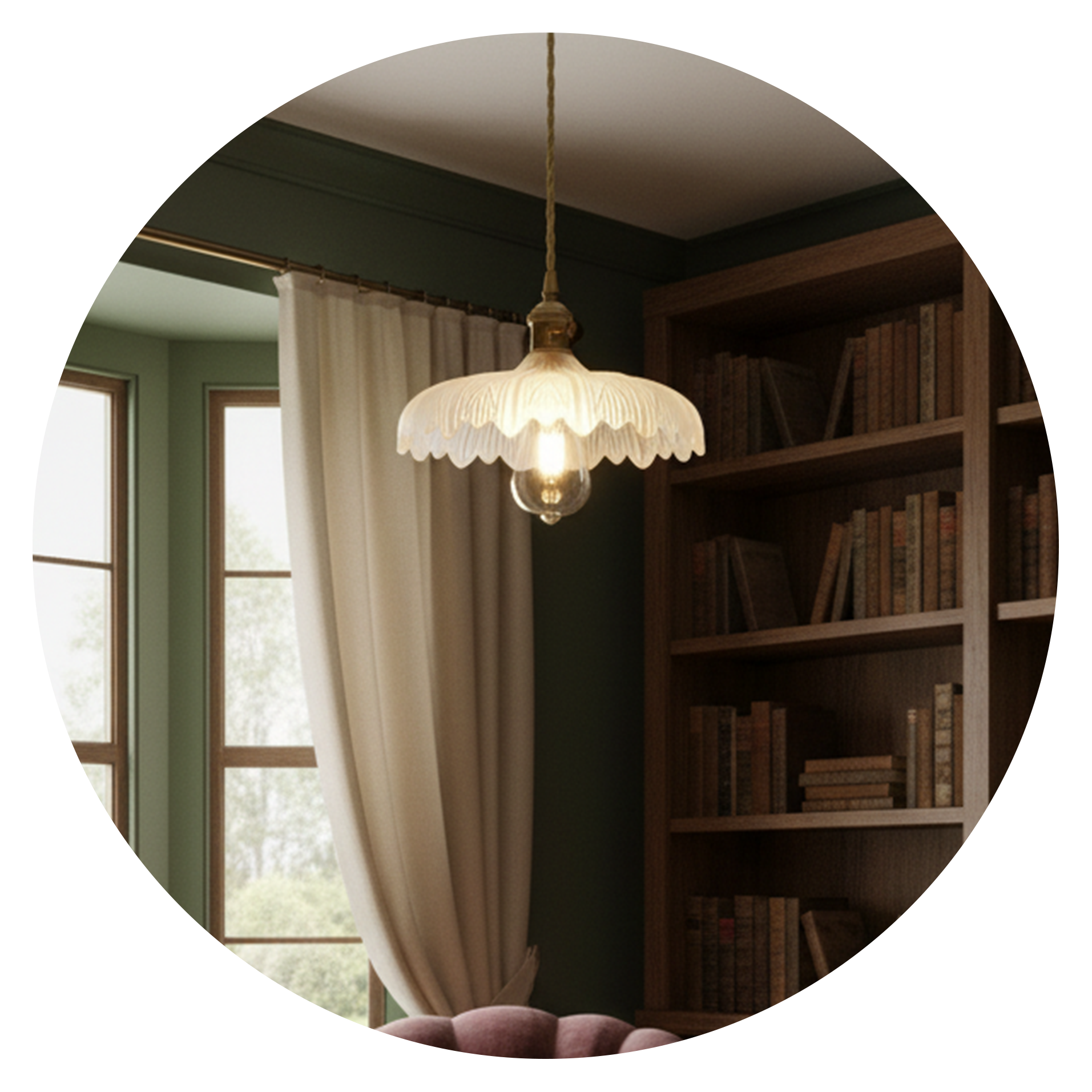 Unlike clear or highly reflective designs, this piece focuses on comfort and atmosphere, making the light feel more subtle and enveloping. The delicate edge detail adds a touch of vintage elegance without overwhelming the overall simplicity.