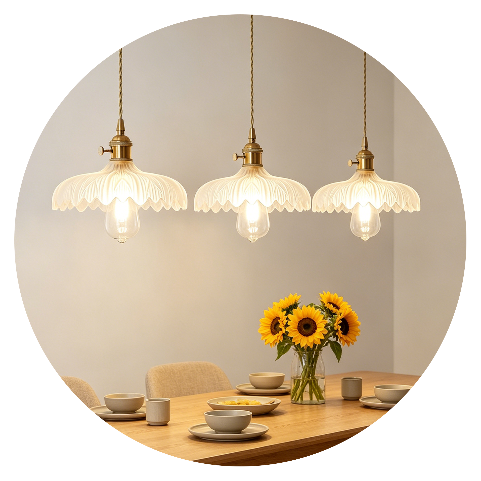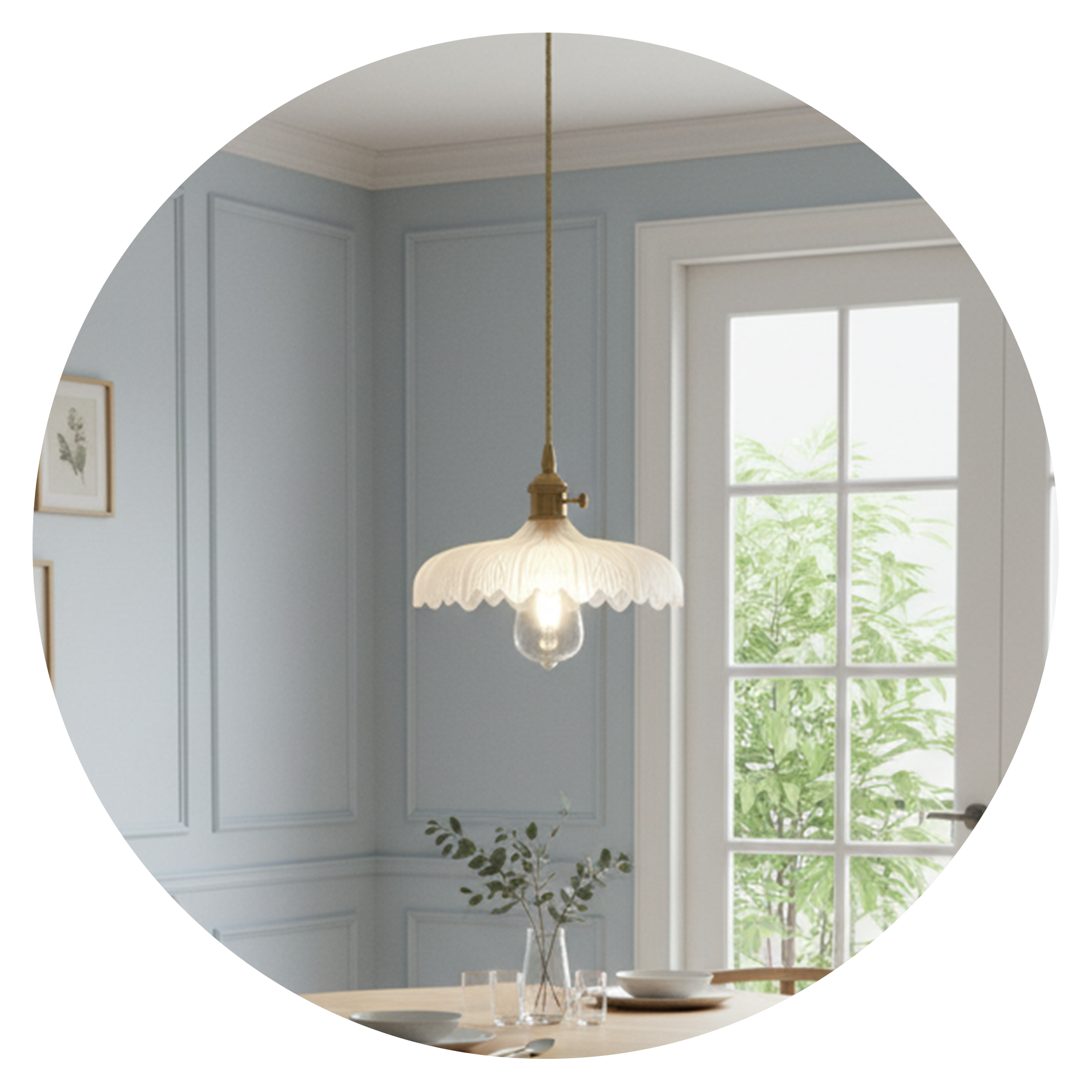 April 20, 2026This pendant light is defined by its softly frosted glass shade and gently scalloped edge, creating a warm and diffused glow that feels calm and inviting. The semi-opaque surface softens the light significantly, reducing glare and giving the illumination a smooth, ambient quality.